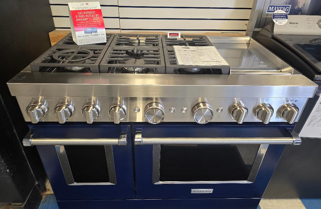 Satisfy your craving to create with a 48-inch KitchenAid® Commercial-Style Range with Even-Heat™ Chrome Electric Griddle. This dual fuel range combines an electric double oven with a 6-burner gas cooktop. Two 20,000 BTU Ultra Power™ Dual-Flame Burners offer power and precision to successfully sear, simmer, stir-fry and saute´. Even-Heat™ True Convection helps you achieve more consistent baking and roasting.Read More